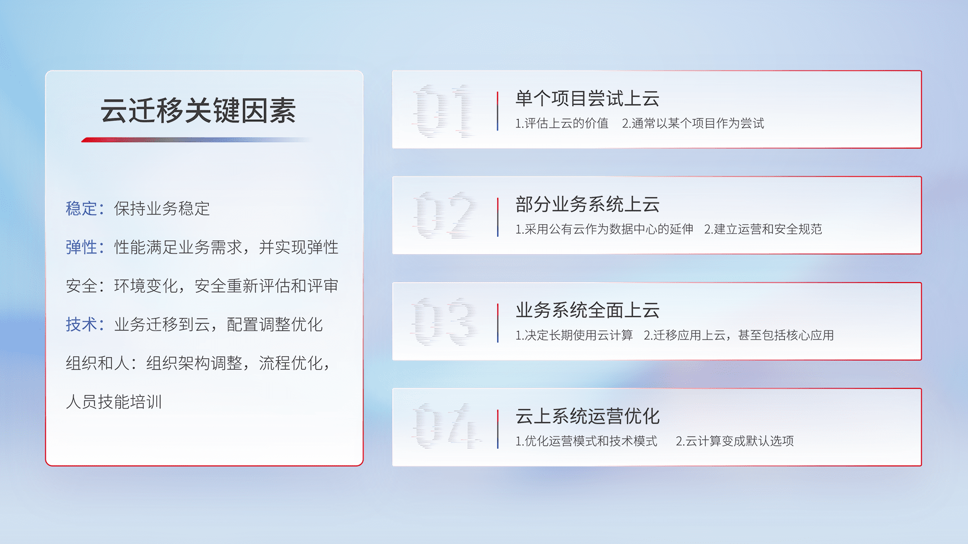 结合实际业务,,,从规划设计、、、、云平台选型、、、云原生改造、、、、数据迁移、、、集成交付,,,迁移全过程为客户识别最佳上云路径,,,做好风险识别管理,,设计网络架构、、、身份权限、、、、安全审计合规、、、操作审计、、、日志审计、、、监控告警策略、、、多站点容灾设计等,,,,对云上基础设施进行整体规划,,提升IT治理水平,,,以满足弹性、、、高可用、、高性能的需求。。。