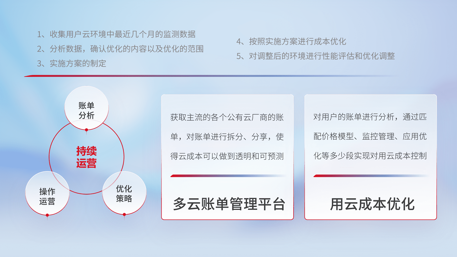 通过多云纳管,,,以统一的资源数据模型把客户的云资源进行抽象和封装,,,进而实现对多云资源的统一操作,,,,保障云资源管理的可靠性、、稳定性与可用性。。量身定制化运维内容,,配置、、、、开发运维、、、补丁管理、、、、备份、、、、监控、、、、认证和访问管理、、审计和日常巡检等,,,,保障在用云过程中的可靠度,,,,稳定度以及高可用率。。。